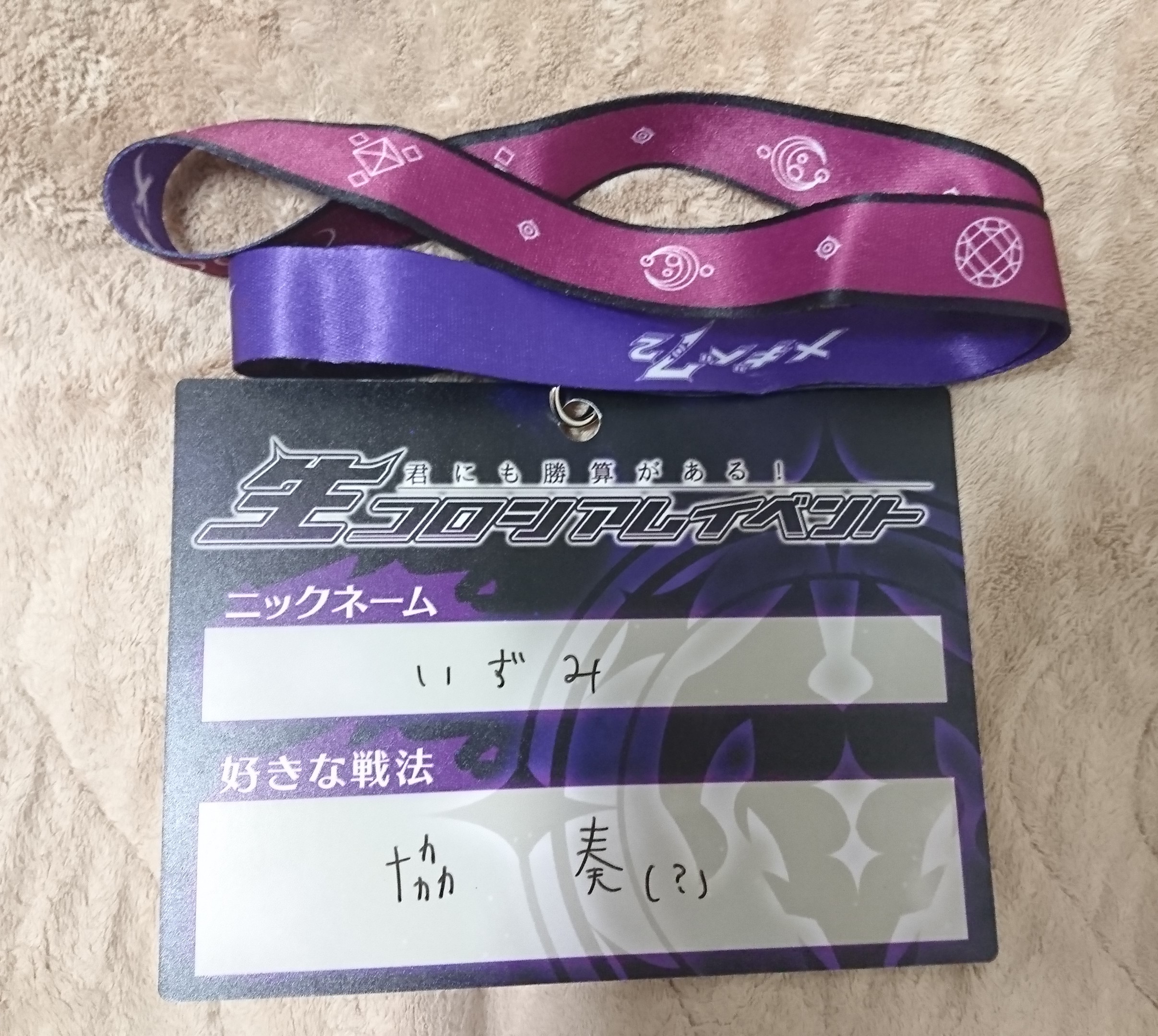 机の上にPvP用のルームの説明とアンケート用のQRの紙、首から下げるネームと好きな編成を書く紙?が置かれてました。