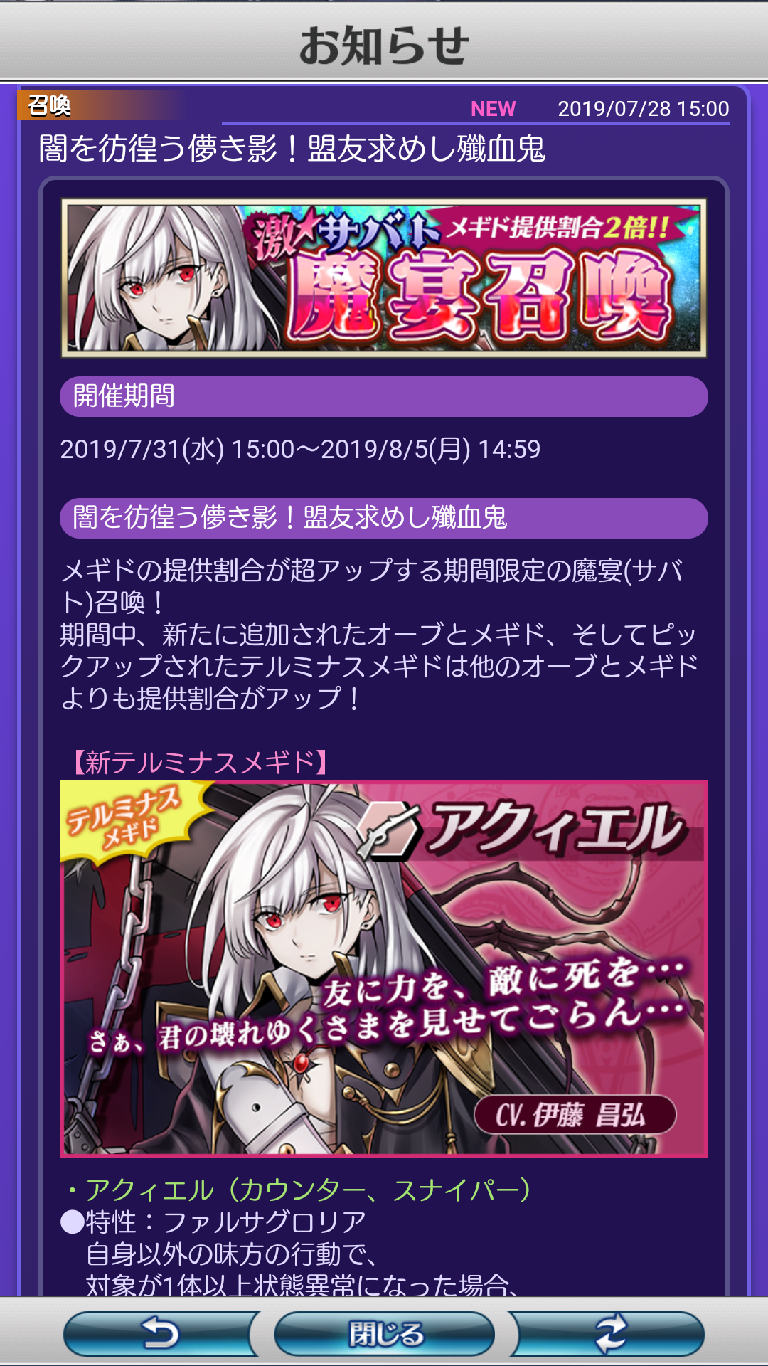 そして!ゲーム内お知らせに新キャラのアクィエルくんのガチャのお知らせが出ましたね!!